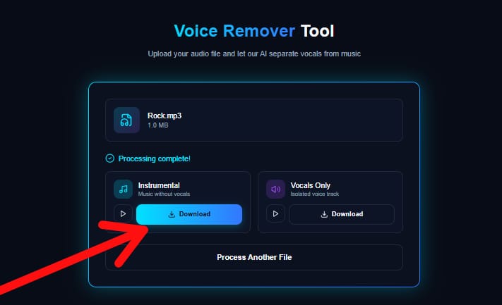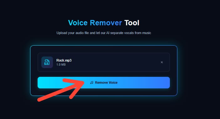 Once your file is uploaded, simply click the Remove Voice or Process button. The tool uses advanced audio processing technology to separate vocals from background music automatically.